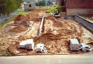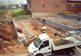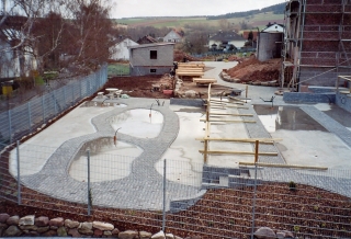 Die ersten Mauern sind gesetzt. Zu- und Abwasser-, sowie Stromleitungen werden verlegt. |